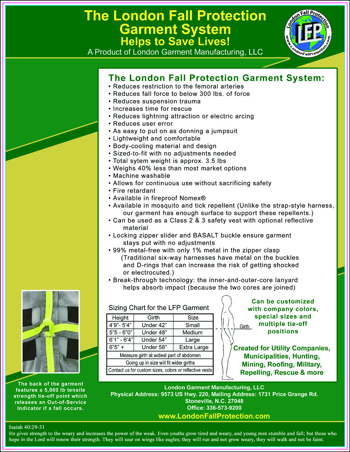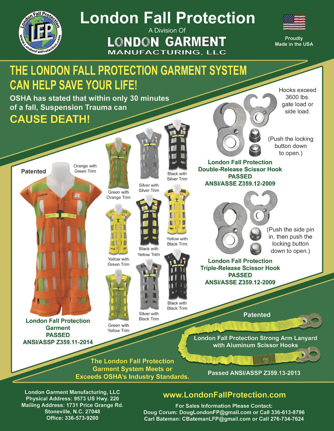 fall protection, London Garment Manufacturing, London Garment Mfg, London Fall Protection, London FP,  fall protection garment, fall protection garments, fall arrest system, fall arrest systems, personal fall arrest, personal fall arrest system, fall arrest, fall arrest garment, fall arrest garments, safety garment, safety harness, safety equipment,  fall protection harness, safety, roof anchors, roofing, utility companies, femoral artery, suspension trauma, reduce fall force, lanyards, lanyard hooks, Stoneville, NC, harness, garment, garment manufacturer, garment manufacturing, fall arrest harness, fall protection harness, gripper shoes, fall arrest jacket, fall protection jacket, fall protection company, best, #1, number 1, number one, best rated, easy to put on, safety lanyard, fall protection lanyard, lanyard hooks, hunting safety harness, hunting safety garment, hunter safety, bucket truck harness, repelling harness, repelling garment, military harness, tactical harness, Berry Admendment, USA harness
